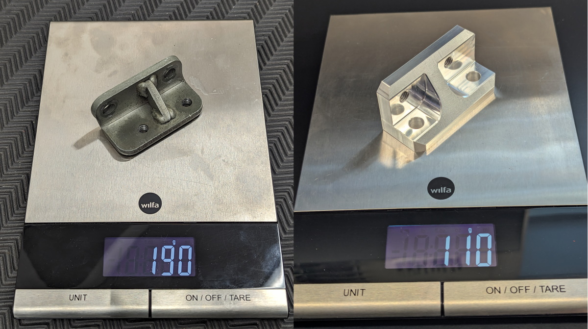 It only weighs about 57% of what the stock mount does and saves around 80 grams / 2.8 ounces of weight located a head of the front axle.