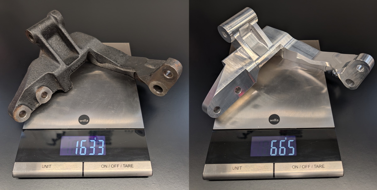 It only weighs about 40% of what the stock mount does and saves around 1 kg / 2 lbs of weight located a head of the front axle.