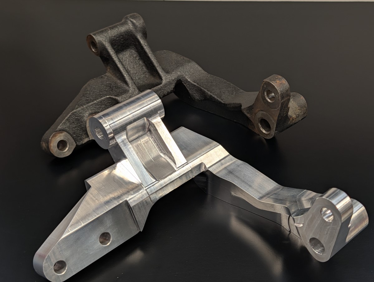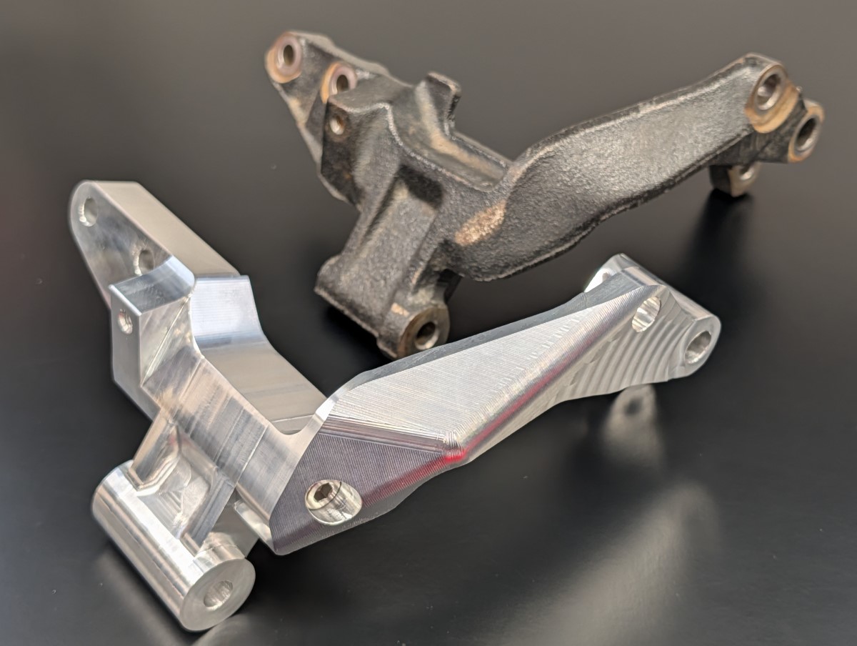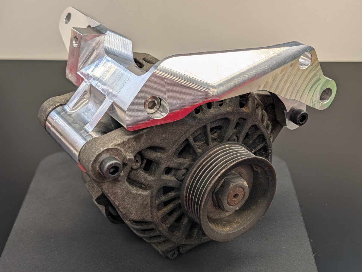 This is a billet aluminum version of the stock Mitsubishi 3000GT/GTO/Dodge Stealth alternator mount. It's made from 7075 aircraft-grade aluminum and has the benefit of being a two piece design which greatly simplifies the removal of the alternator as one half of the mount can be left installed on the engine. The mount comes with a titanium bolt and washer to join the two halves.