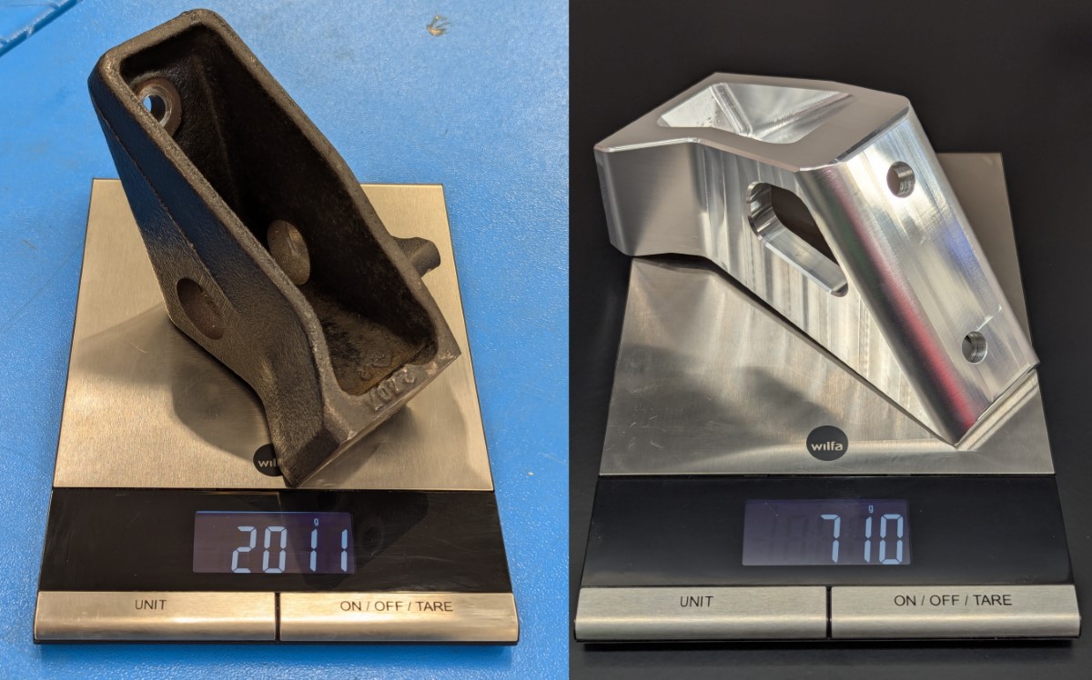 It only weighs about 35% of what the stock bracket does and saves around 1,3 kg / 2.9 lbs of weight located a head of the front axle.