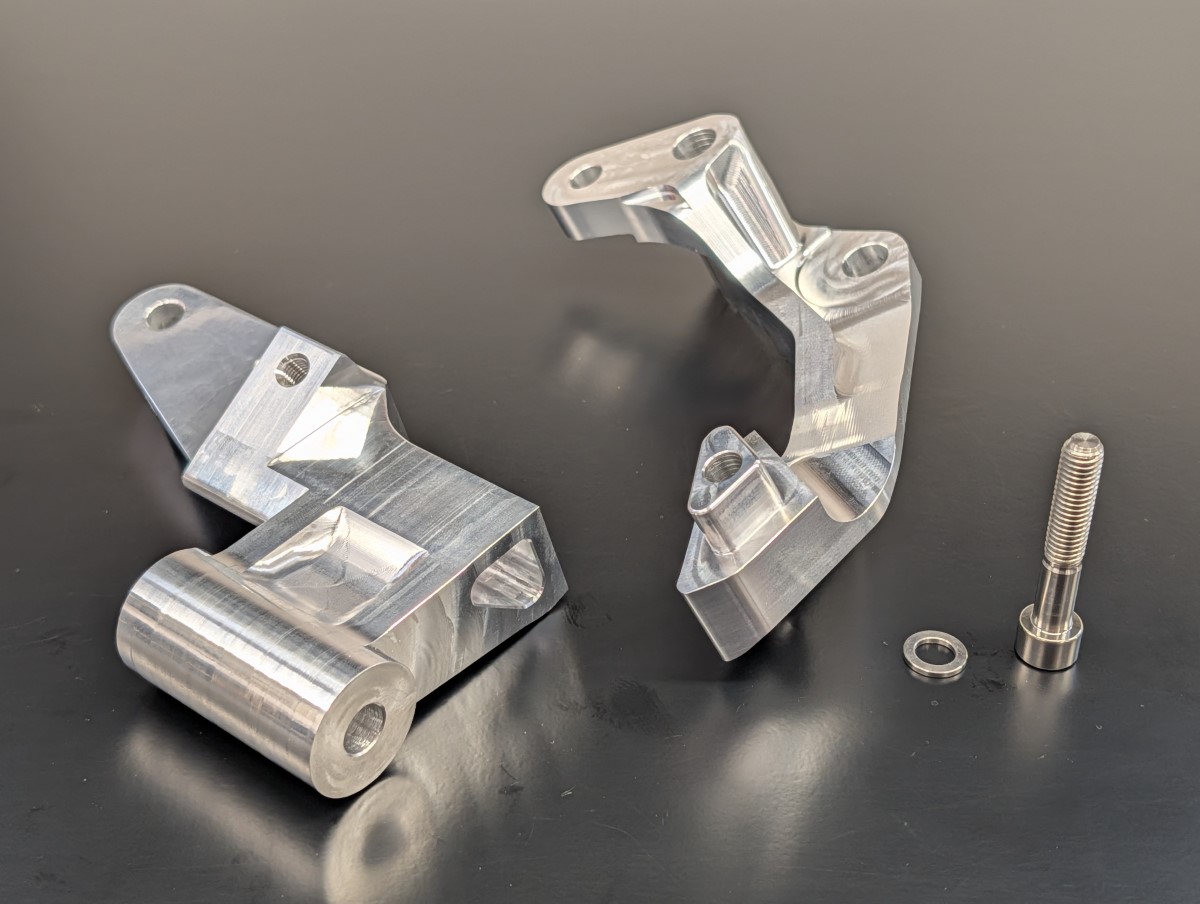 This is a billet aluminum version of the stock Mitsubishi 3000GT/GTO/Dodge Stealth alternator mount. It's made from 7075 aircraft-grade aluminum and has the benefit of being a two piece design which greatly simplifies the removal of the alternator as one half of the mount can be left installed on the engine. The mount comes with a titanium bolt and washer to join the two halves.