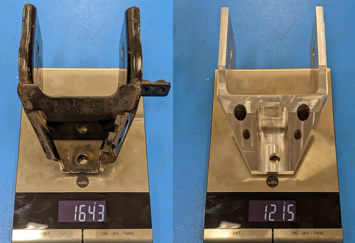 It only weighs about 73% of what the stock mount does and saves around 428 grams / 15 ounces of weight located a head of the front axle.
